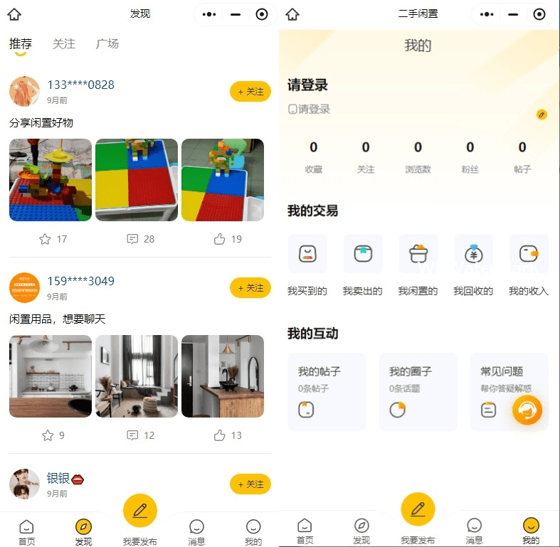 5、发现:帖子集市,分推荐、关注、广场三个板块