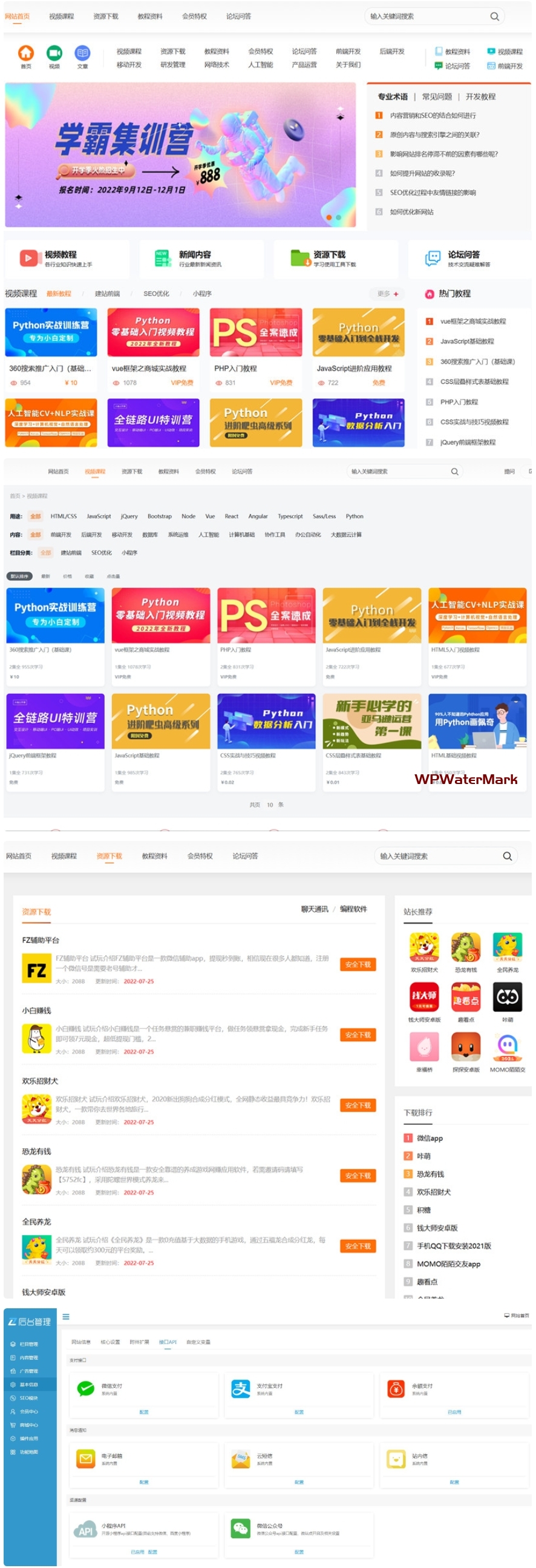 特点:软件下载 视频教程 知识付费这是一款知识付费平台模板,后台可上传本地视频,批量上传视频连接,视频后台可设计权限观看免费试看时间时长,会员等级观看,付费观看等功能,也带软件app权限下载,帮助知识教育和软件推广企业提升业绩,解决流量获客痛点。注:会员中心视频订单和播放记录是需要单个付费购买的视频才能显示视频订单和播放记录。