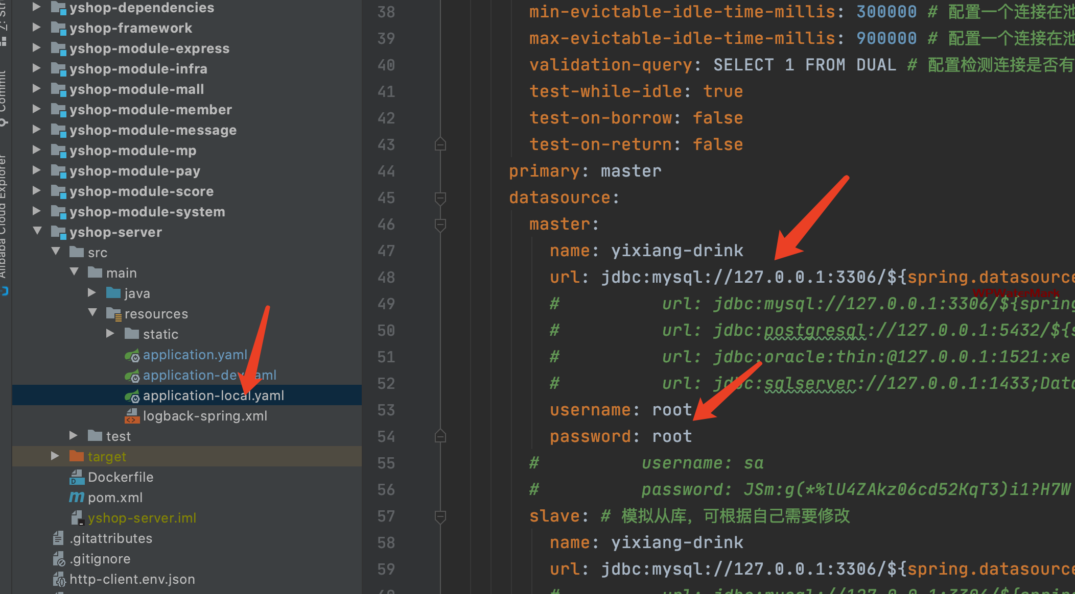 - 3.3 找到项目下的yshop-server 的yml,修改数据库相关信息和redis相关信息,如图: