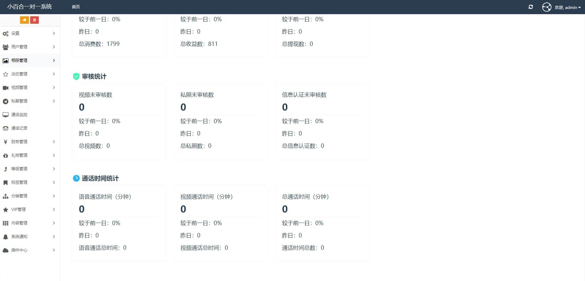 后台管理系统基于PHP构建,提供直观的操作界面。运营人员可以管理用户账号,包括审核、封禁和权限设置;审核用户发布的动态内容,防止违规信息传播;管理礼物交易订单,查看收入报表;配置匹配规则和奖励策略,优化用户体验。数据统计模块实时展示用户活跃度、通话时长、收入趋势等关键指标,助力数据驱动决策。