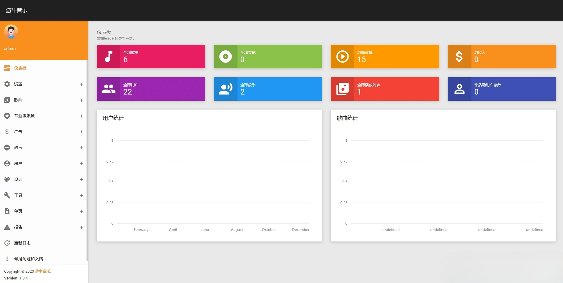 系统配备了专业的后台运营管理模块,管理员通过访问特定的后台地址(默认为`/admin-panel`)并使用初始账号密码登录后,即可进入管理界面。后台主要功能包括:内容管理:对所有用户上传的音乐进行审核、编辑、分类设置及违规内容下架操作;用户管理:管理注册用户信息,处理用户举报,维护社区秩序;财务管理:查看所有付费下载订单的流水记录,进行基础的营收统计;系统配置:修改网站基本信息、联系方式、支付相关设置等全局参数。完善的后台功能使得单人即可高效完成平台的日常运营与维护工作。