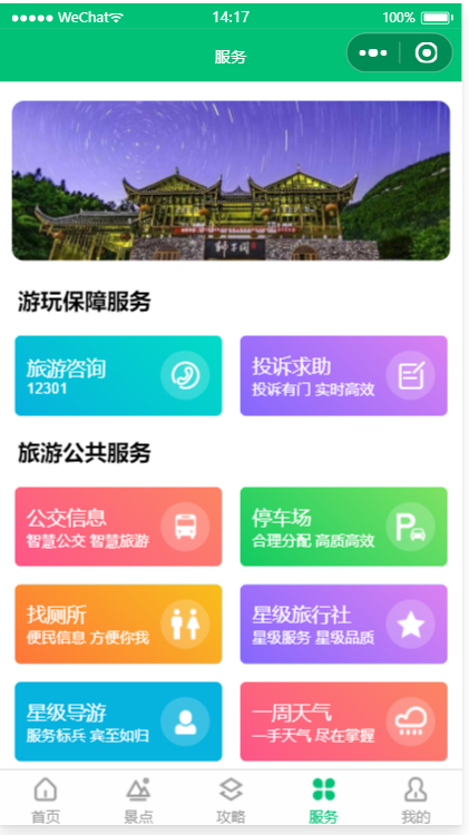 为游客朋友提供多元化服务的一站式数字文旅平台,提供“吃、住、游、购、娱”等旅游行程中的多种服务,全面支持景区介绍,景点攻略,景点预约,停车预约、景区导览等功能,游客可以在小程序中了解旅游度假区的景点信息、历史文化、各类活动等。前后端代码完整,采用腾讯提供的小程序云开发解决方案,无须服务器和域名。
