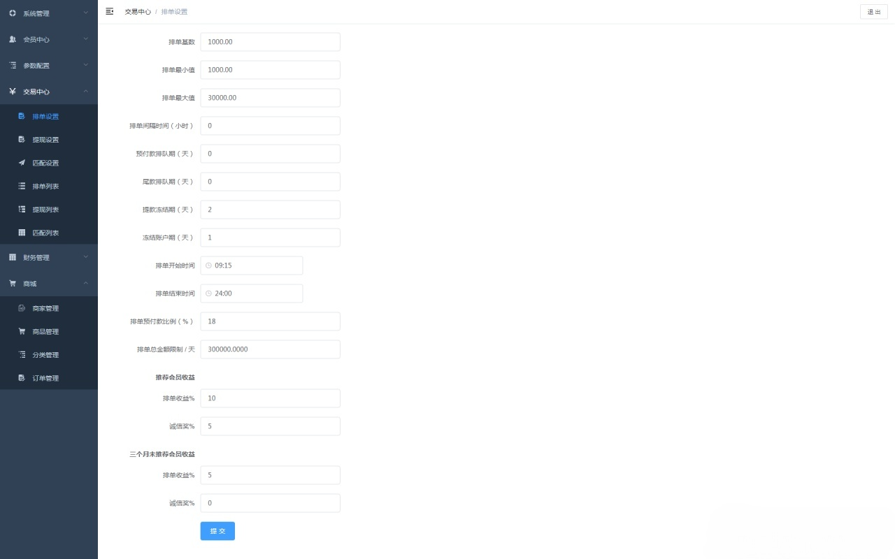 - 后台配置管理:提供全面的后台设置选项,包括币种兑换比例、奖励参数、排单规则等,管理员可轻松调整系统参数以适应运营需求。