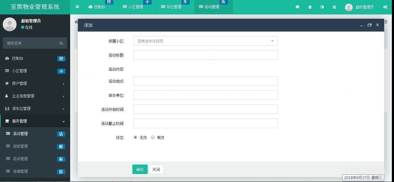 主要模块有社区活动管理、客户投诉管理、报修管理、信箱管理。