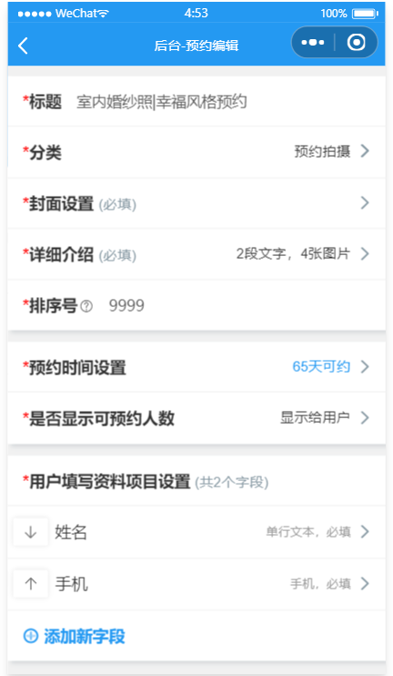 拍摄预约管理:开始/截止时间/人数均可灵活设置,可以自定义客户预约填写的数据项