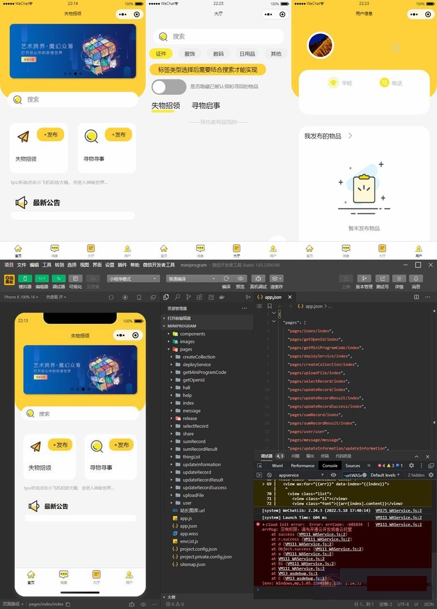列表内可以筛选物品类别或精确搜索,物品详情里可展示物品的相关信息,确认是自己的物品后可点击认领,然后验证信息,需填写物品的关键信息以作辨认,防止冒领误领,物品详情页可生成二维码海报分享,还有即时的消息联系功能以提高沟通效率,发布者还可选择放置在代收处,双方还可以通过拨打电话紧急联系,用于紧急情况,让失物找到主人,个人中心可以管理发布的物品帖子,管理个人信息,包括昵称、默认学校、手机号的修改、编辑发布的物品帖子、获取帮助等。帮助用户流畅的使用该小程序。