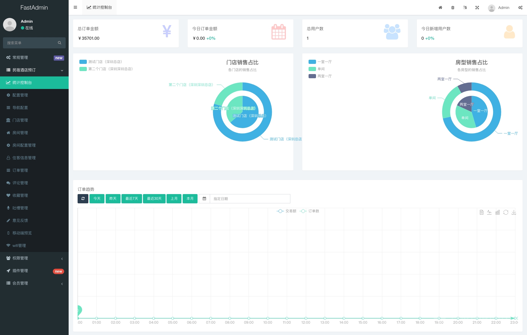 - 统计分析:按年 / 月 / 日统计订单数、金额,还能看当日数据和注册用户数;