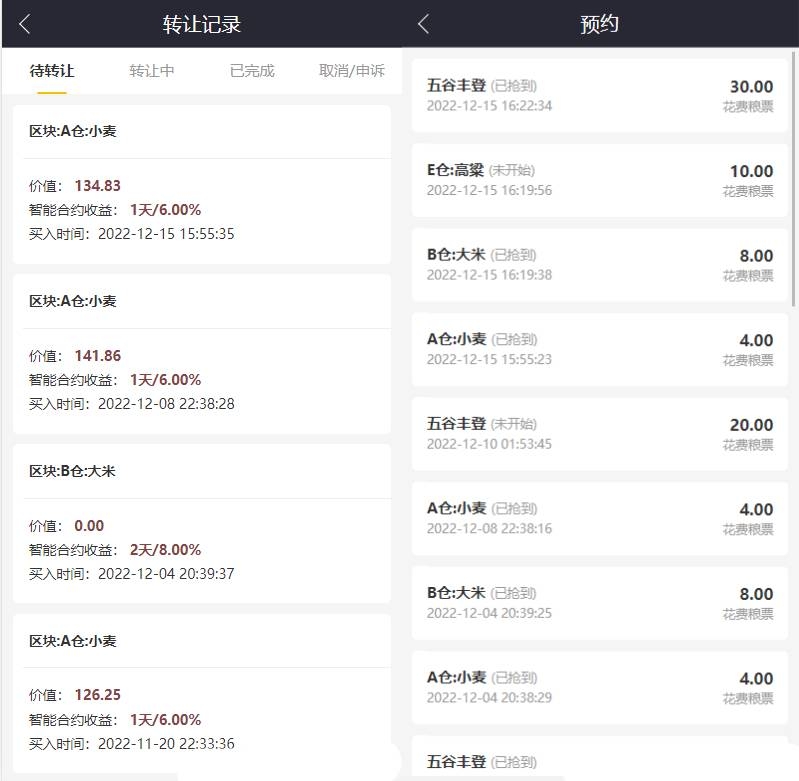 每天抢购交易时间分5个时段,在每个规定时间段内,抢到则能下单,抢不到只能等下一轮,抢不到退回预约粮票。