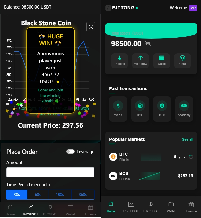 单语言,纯英文的一套虚拟货币投资理财程序,不是微盘、交易所却类似微盘、交易所,一样有秒合约交易、杠杆交易功能,但是做得比较简洁
