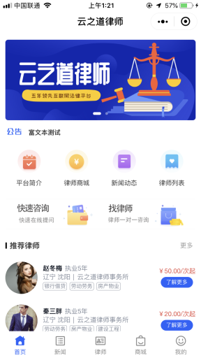 律师小程序是连接用户和律师两端的法律服务平台。