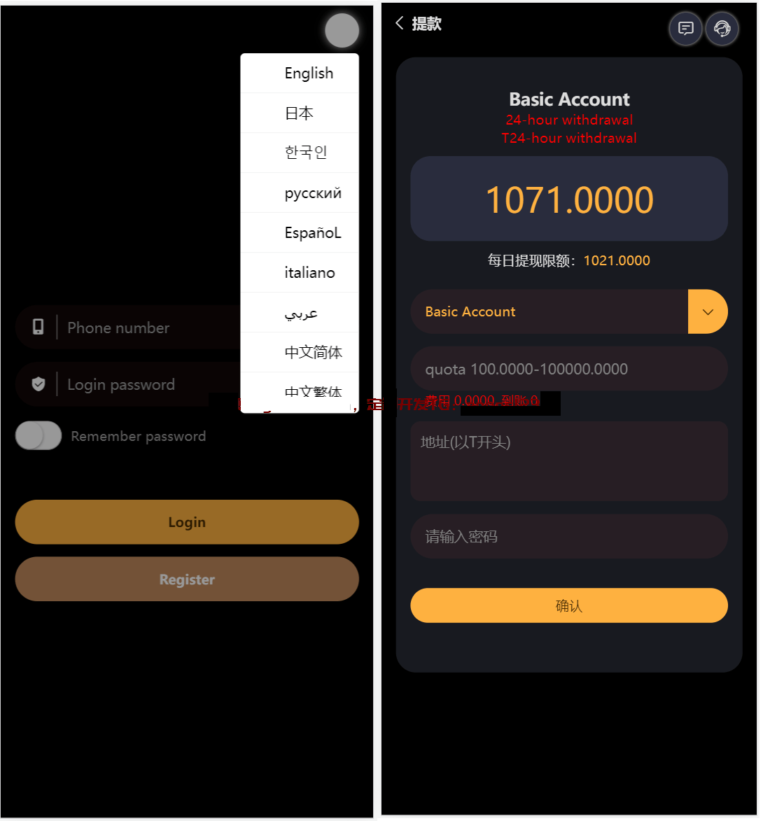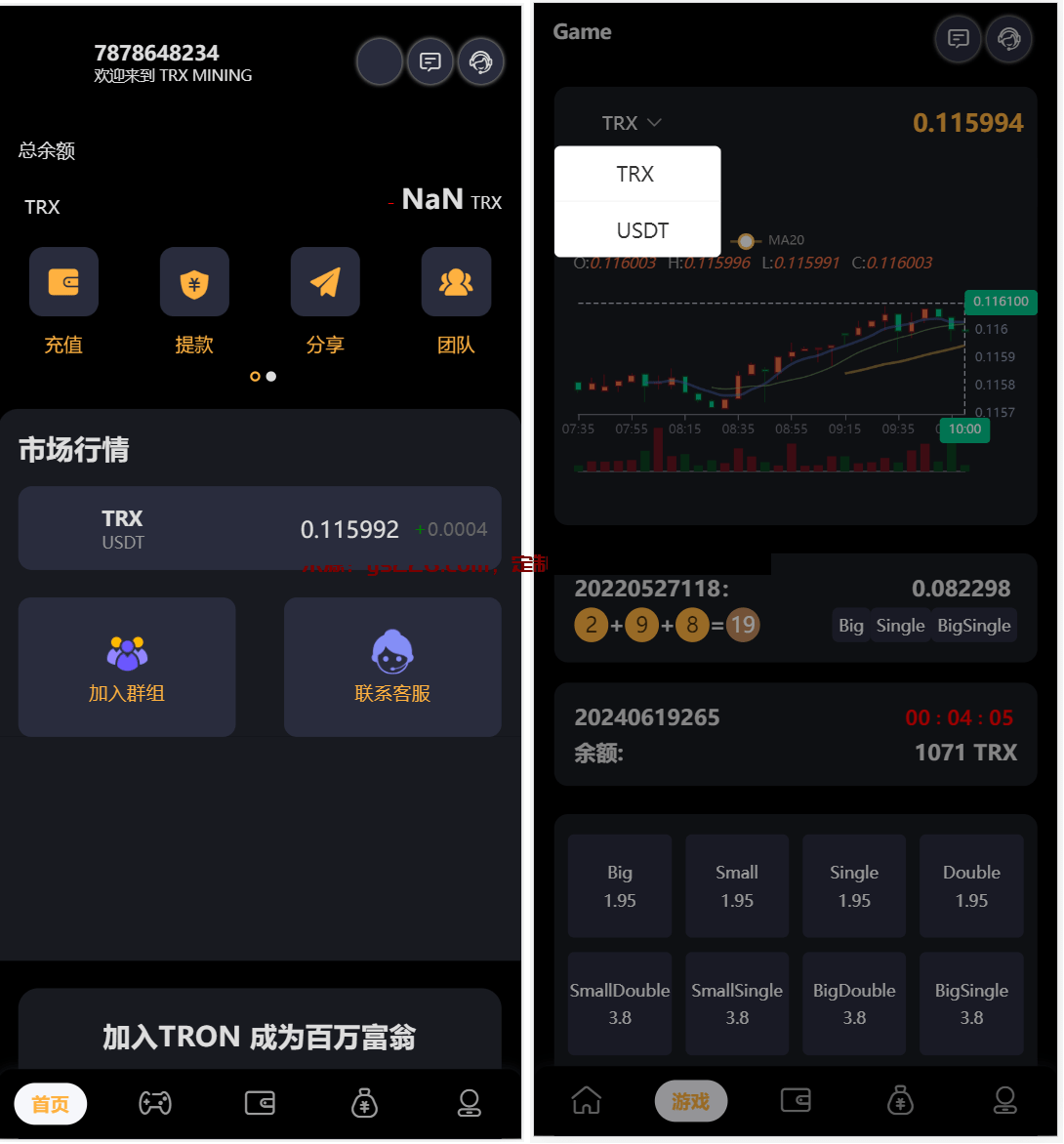 admin APP源码 区块链-虚拟币-交易所 投资理财 1天前 YM921-UI漂亮大气的多语言trx/usdt区块链游戏php源码 前端是编译后的,系统支持九国语言,后台可显示隐藏开启语言 系统支持trx、usdt充值,充值支持自动到账,附带多个收款地址一键归集 暂无优惠当前隐藏内容需要支付3000积分已有0人支付 支付查看 客服 Q Q: 2047879076 微 信 :wx_xiaochengxu_kaifa2026年优质php源码下载 » YM921-UI漂亮大气的多语言trx/usdt区块链游戏php源码