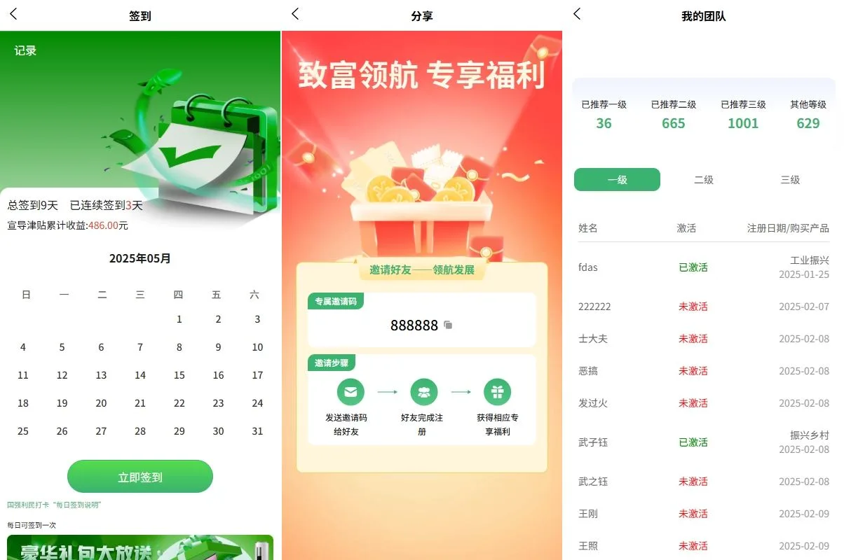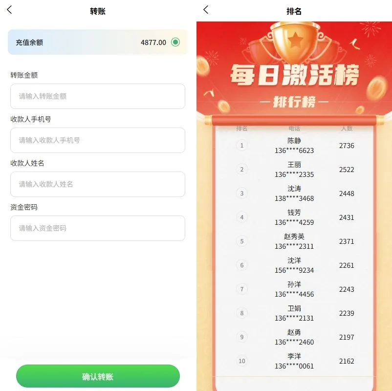 支持签到,内部转账,三级分销,排名等功能
