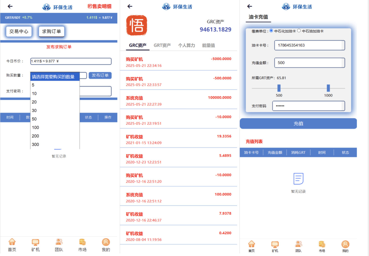 除了云算力矿机还加了GRT/USDT虚拟币、C2C自助交易等功能