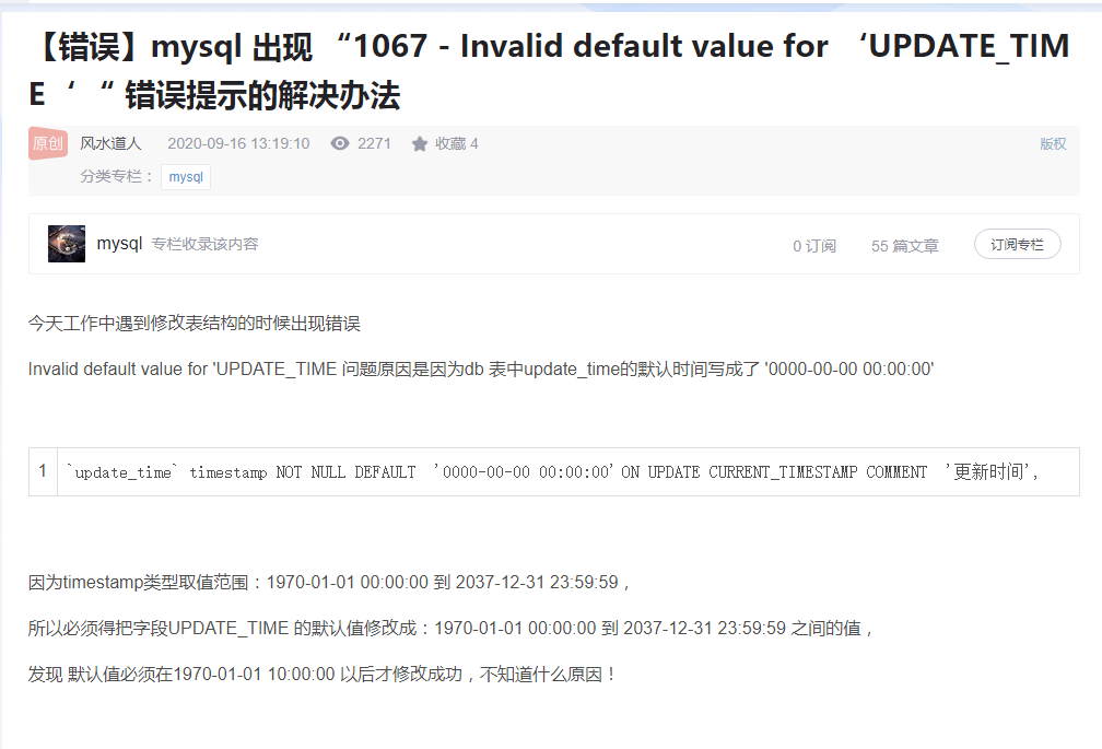 【错误】mysql 出现 “1067 – Invalid default value for ‘UPDATE_TIME‘ “ 错误提示的解决办法
