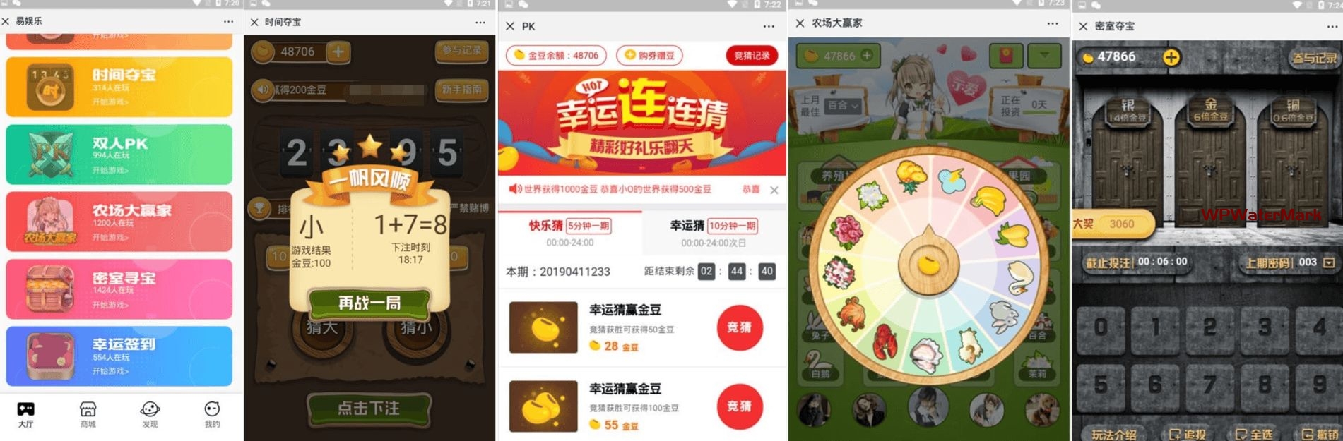 游戏含有:尾号夺宝 ,时间夺宝, 密室寻宝, 双人PK,(类似CP),农场大赢家, 幸运签到