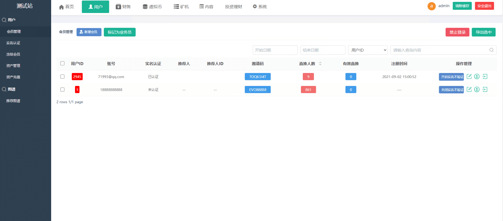 用户:会员管理,实名认证,冻结会员,资产管理,资产充值,图谱