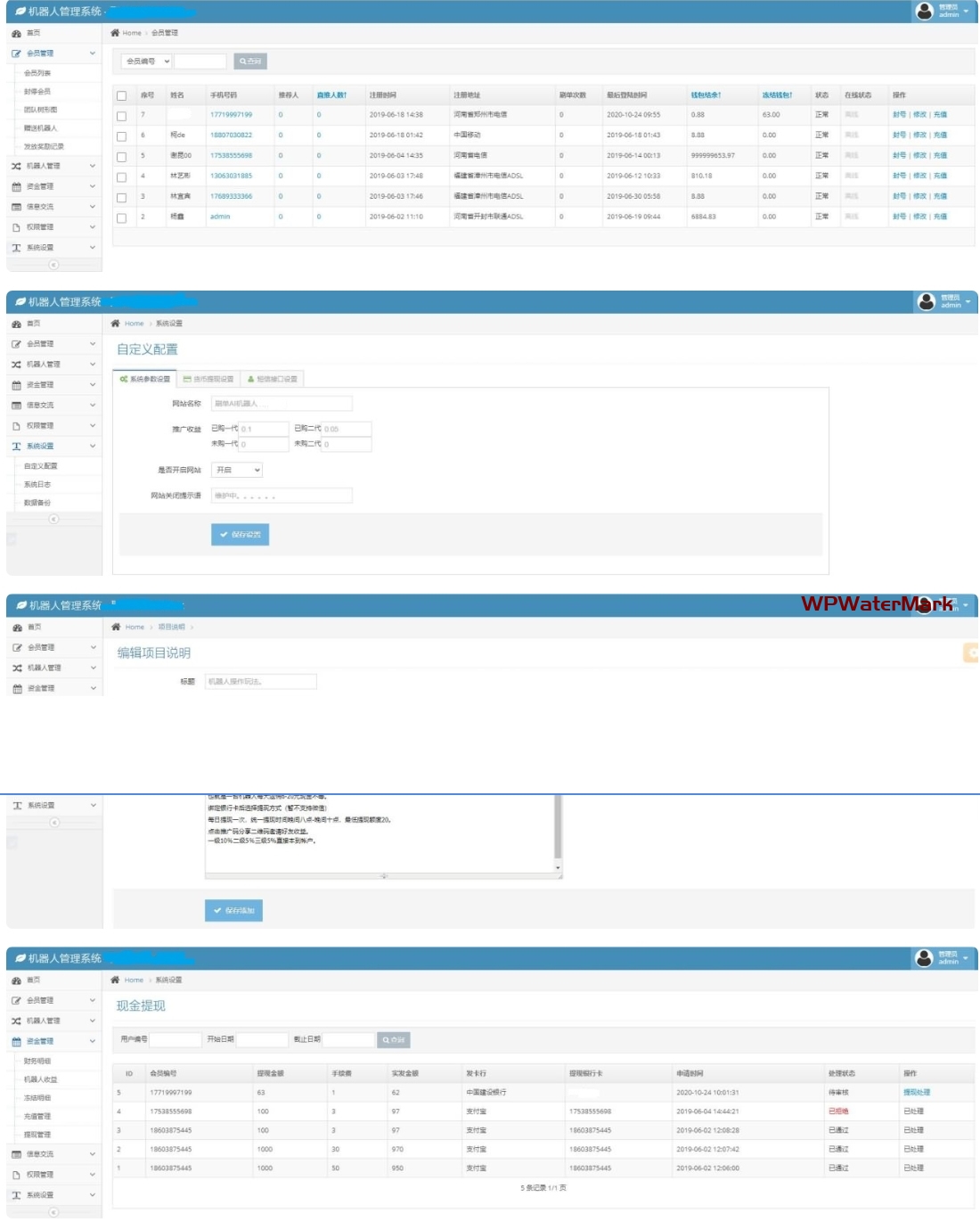 本套AI机器人自动刷广告流量区块链投资源码是一套投资理财分红系统,已对接第三方码支付个人免签支付平台,修复了短信接口,支持短信宝接码。AI流量机器人,自动刷流量赚钱,购买机器人,躺赚每一天,后台完善,可设置机器人每天佣金数,进行资金管理、会员管理等等操作。